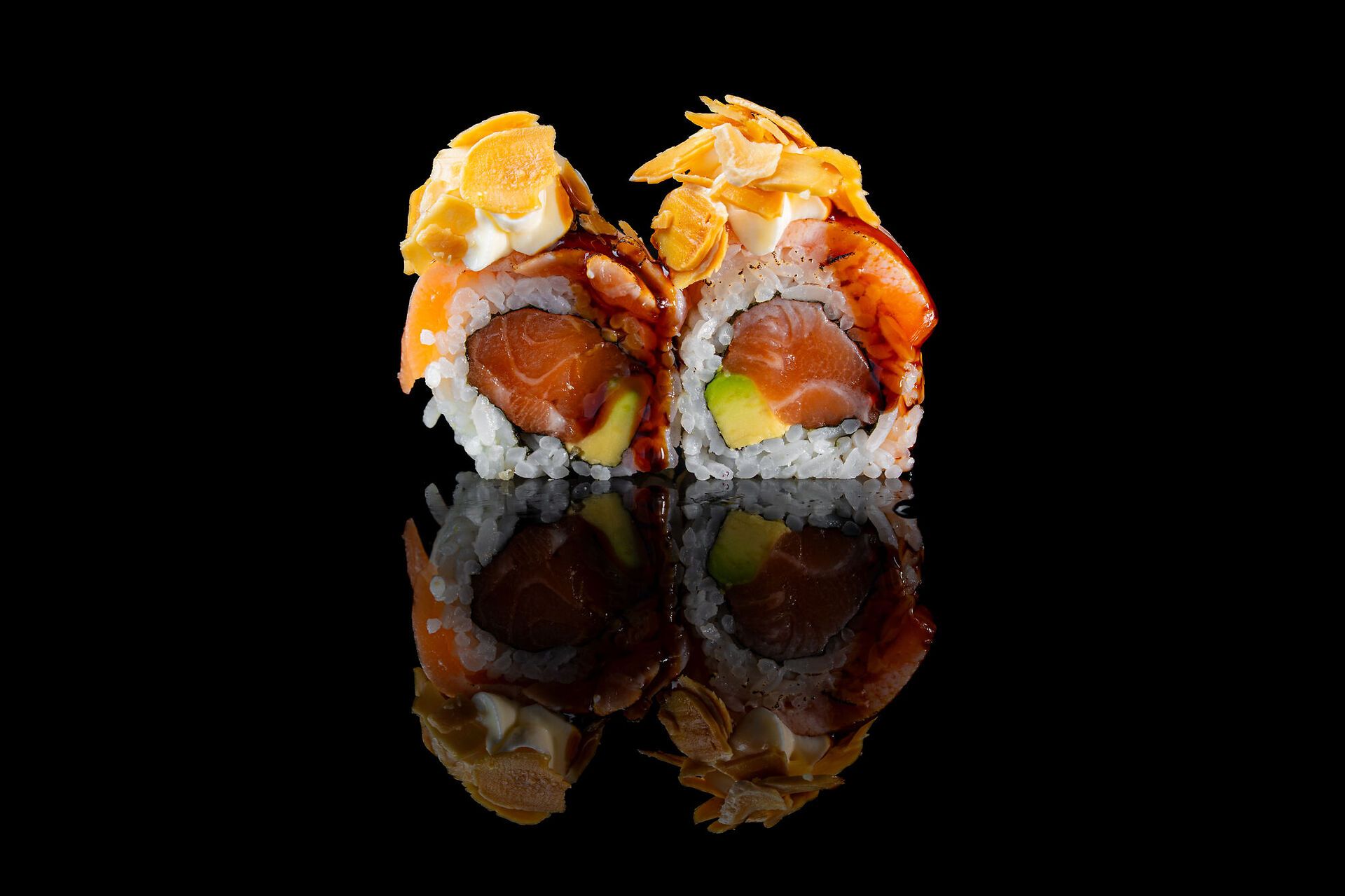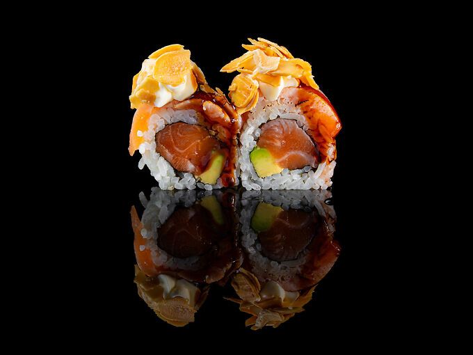 Salmone crudo, philadelphia, avocado, salmone scottato e mandorle