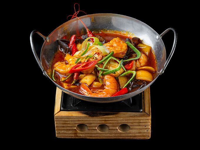 Gamberi, mazzancolle, calamari, funghi cinesi, verdure e peperoncino