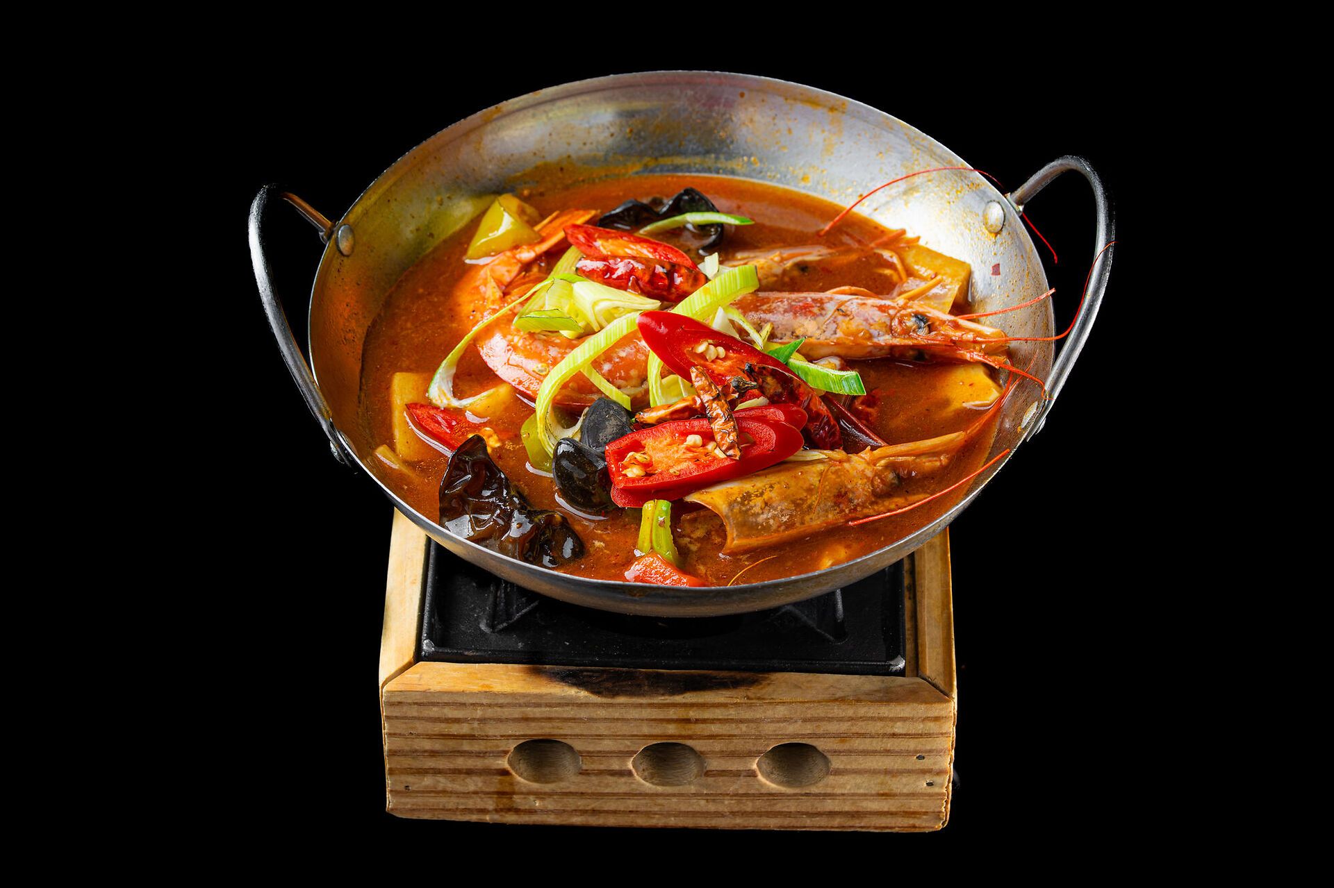 Gamberi piccanti in padella di fuoco