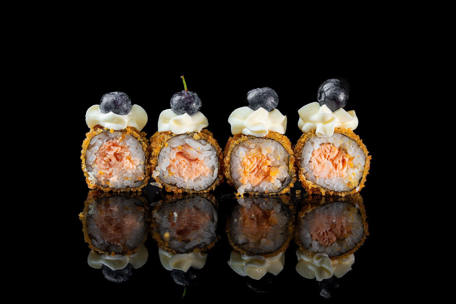 Salmone, philadelphia, mirtillo, pangrattato, riso, alga nori