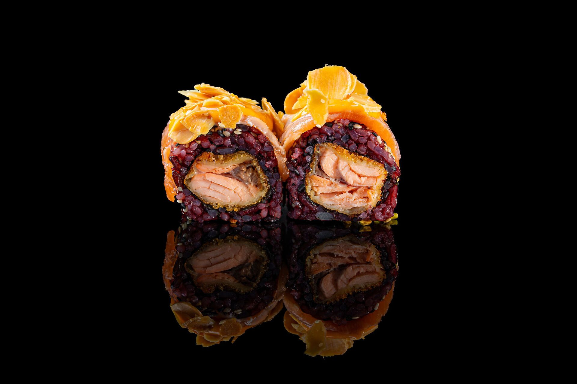 Salmone fritto, salmone scottato, mandorle, sesamo e salsa teriyaki
