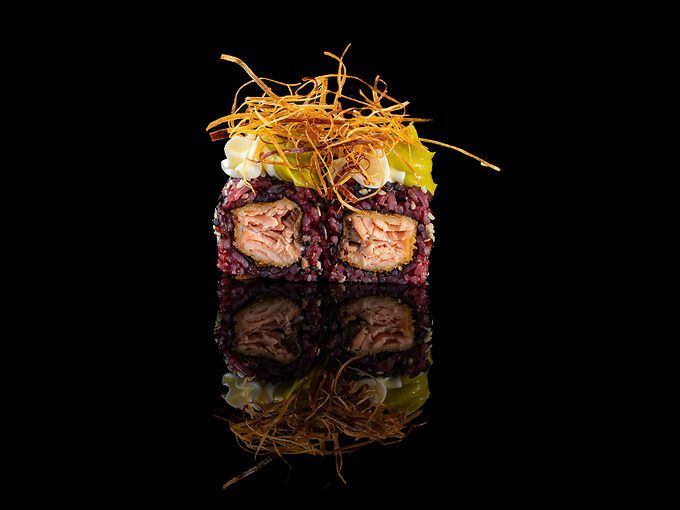 Salmone fritto, philadelphia, salsa avocado, porri fritti