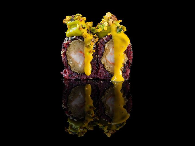 Gamberi fritto, salsa avocado, salsa mango, pistachio e sesamo