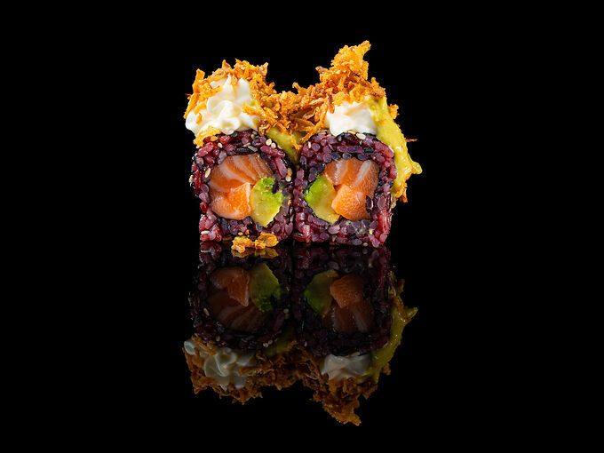 Salmone, philadelphia, avocado, salsa avocado, cipolla fritta croccante e sesamo