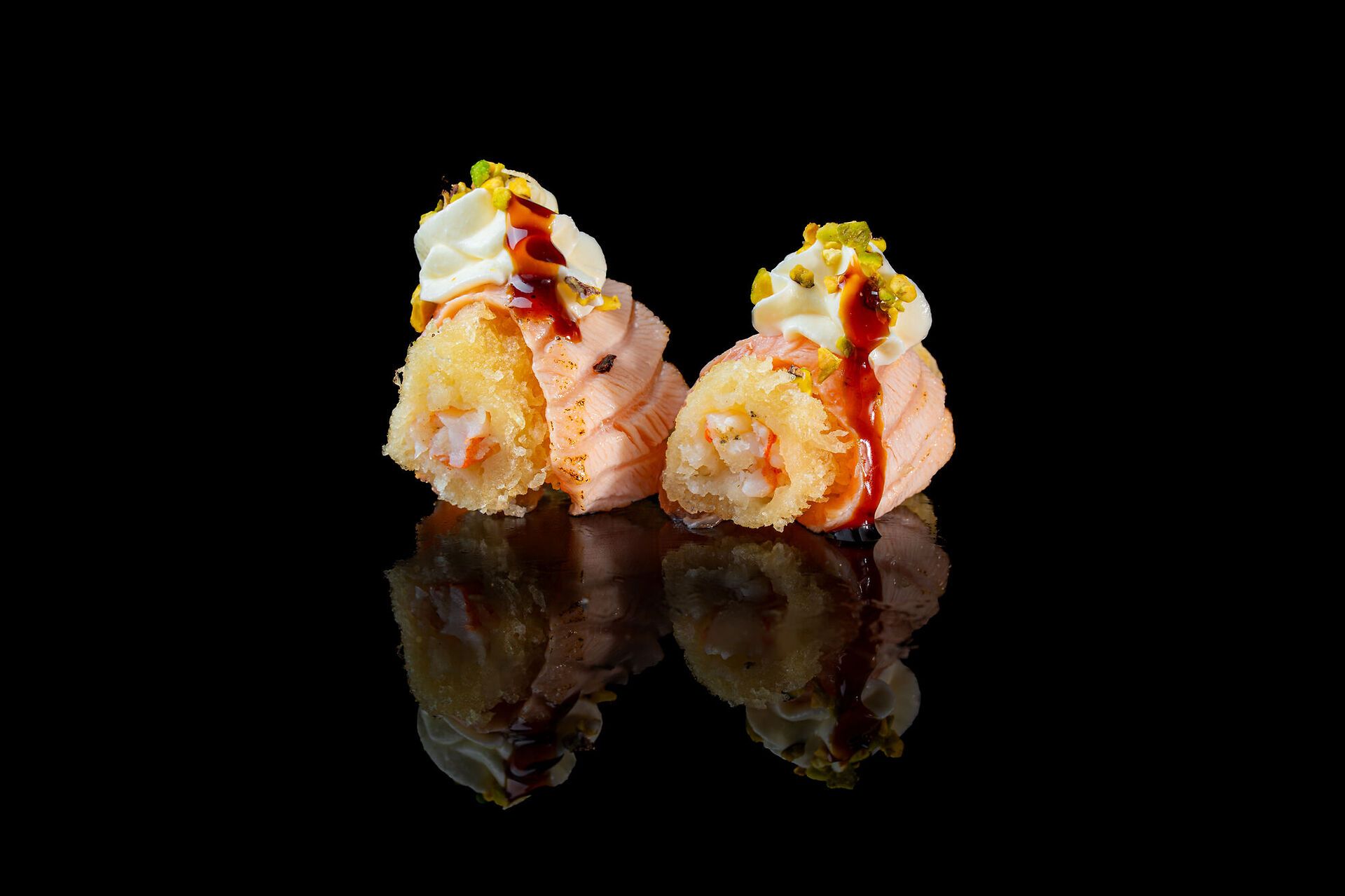 Salmone scottato, tempura di gambero (mazzancolle), philadelphia, pistacchio e salsa Teriyaki