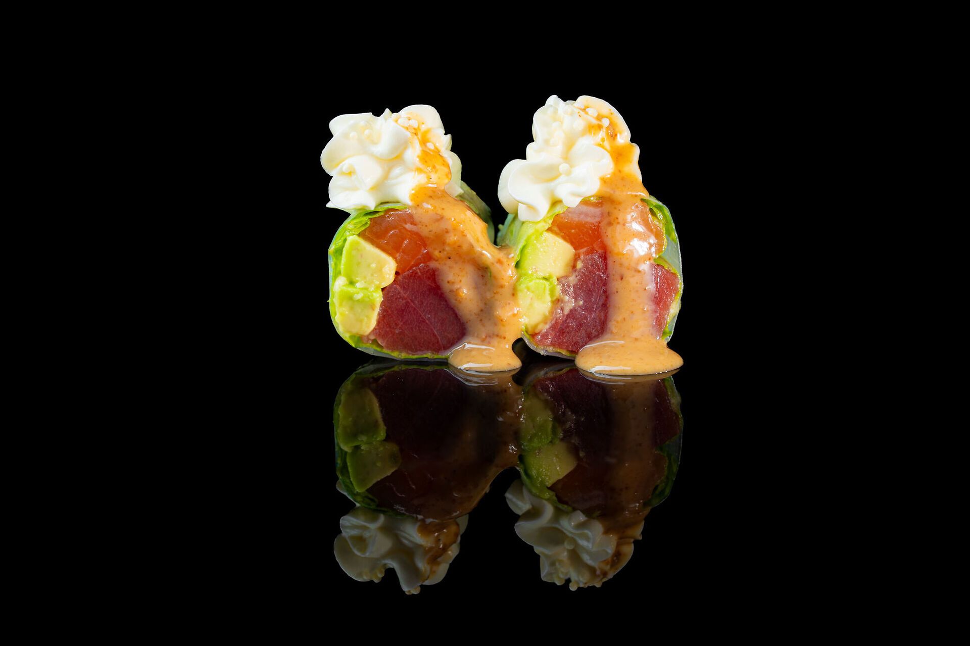Involtini freschi vietnamiti con salmone, tonno, insalata mista, philadelphia, avocado, salsa sesamo
