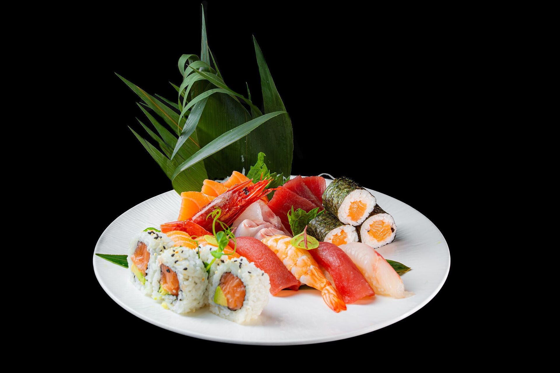 10 sashimi misto, 6 nigiri, 3 hosomaki, 4 uramaki