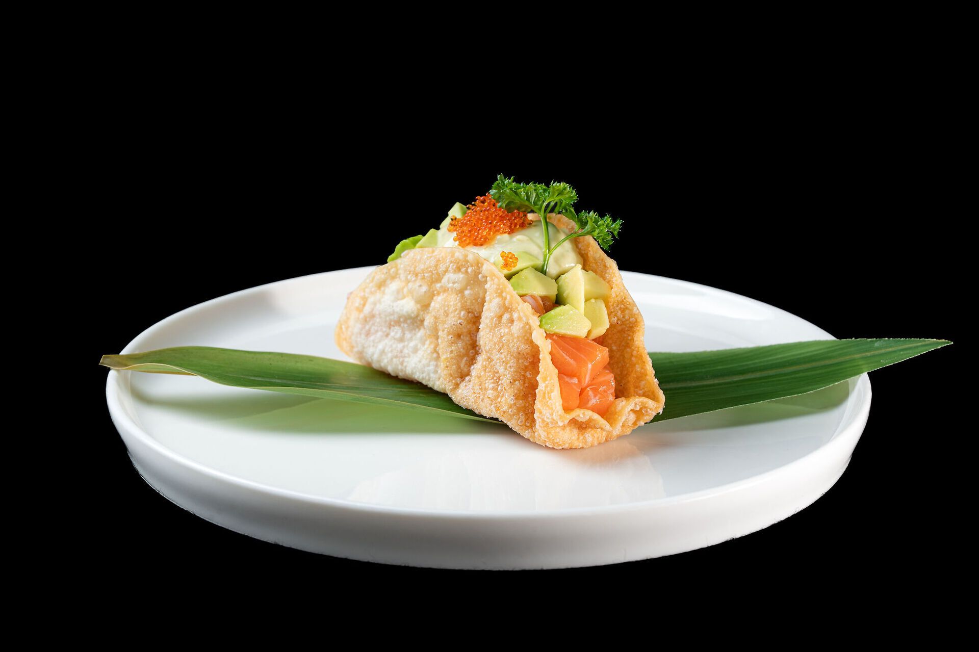 Salmone piccante, avocado, stracciatella, salsa basilico e Tobiko
